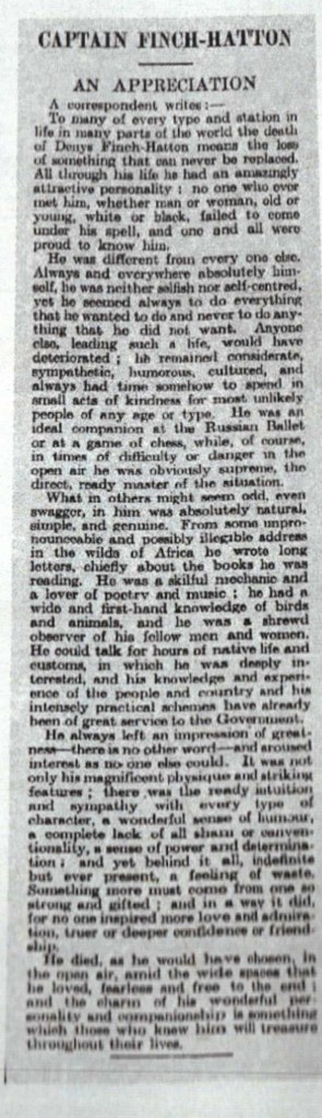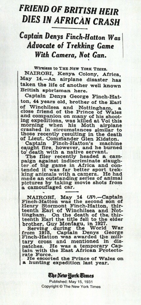 If really lions eventually got to Denys Finch-Hatton grave to wander, it seems to me they should have the previous possibility in mind… Anyway, I didn’t make the world, I just live in it…. Since Denys Finch-Hatton persona and person is sort of unavailable and reality is quite elusive, specially when it comes to these subjects, perhaps his obituary is the most adequate, or the best, image of who he was and it can be seen here ate the obituaries of the New York Times and The Times of London: