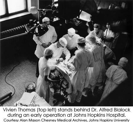 Então Thomas encomendou seus materiais cirúrgicos, limpou e pintou o laboratório, vestiu seu jaleco branco e começou a trabalhar. Em sua primeira caminhada do laboratório até o consultório de Blalock, no hospital do outro lado do campus, o homem negro de jaleco parou o trânsito. O hospital tinha banheiros segregados e uma entrada nos fundos para pacientes negros. Vivien Thomas surpreendeu Johns Hopkins.