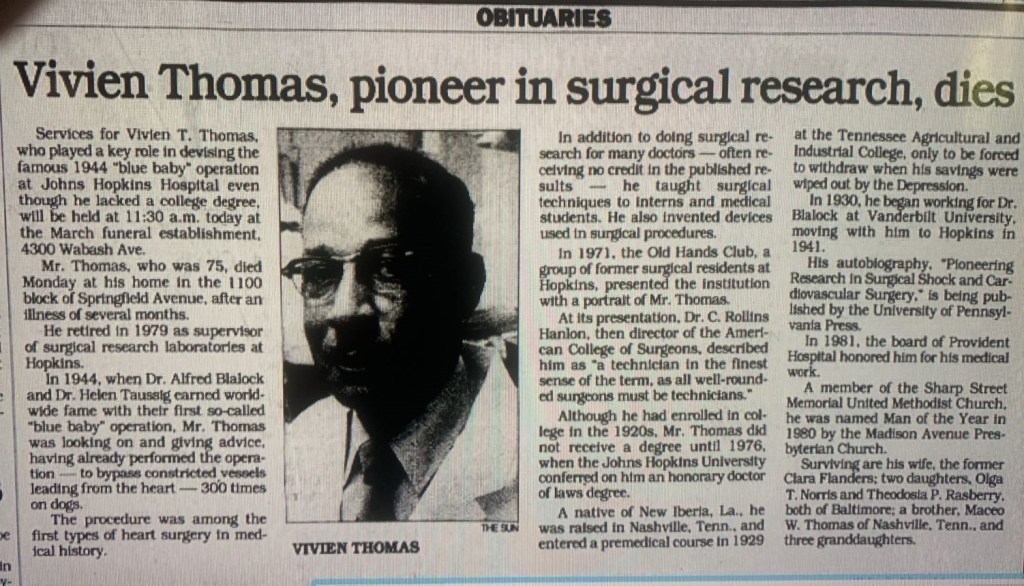 Diga o nome dele e os cirurgiões cardíacos mais ocupados do mundo irão parar e conversar por uma hora. É claro que eles têm tempo, dizem, esses homens que contam o tempo em segundos, que correm contra o relógio. Isto é sobre Vivien Thomas. Para Vivien eles arranjarão tempo.