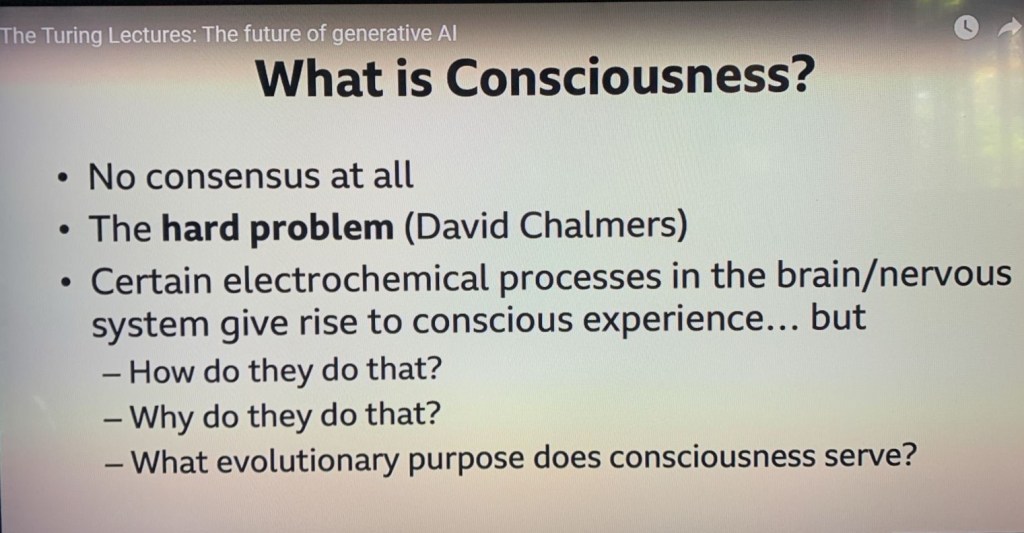 Consciousness pode ser discutido sob diversos prismas, mas vamos procurar nos ater aos que efetivamente podem ser conectados com Inteligência Artificial e neste sentido, o Dr.Michael Wooldridge apresentou os seguintes slides que nos levam diretamente ao ponto em questão:
