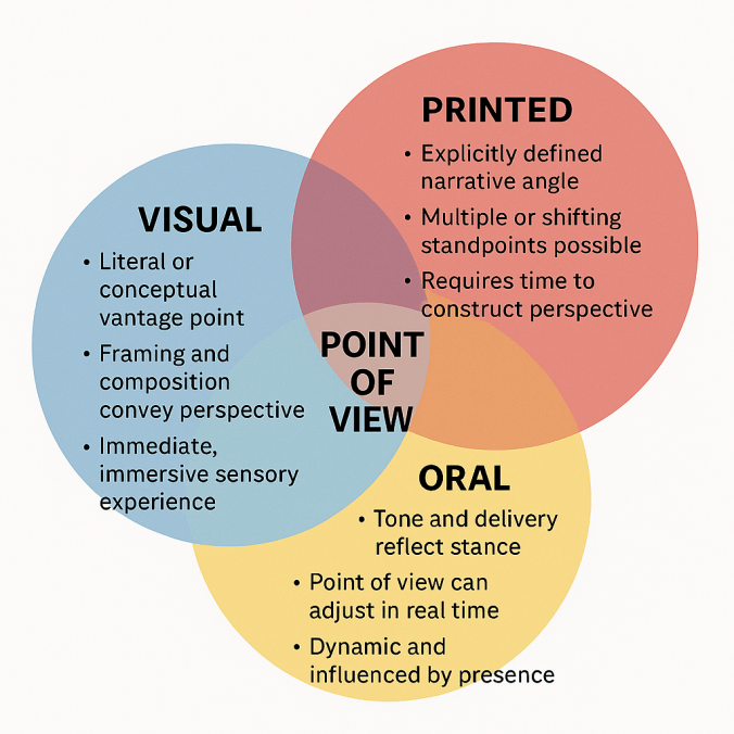 ChatGPT said: Certainly — point of view is a fascinating lens for comparing visual, printed, and oral communication, because each medium shapes how perspective is presented, perceived, and interpreted.