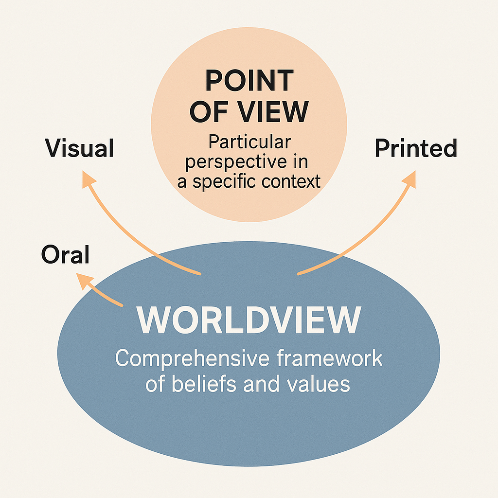 If you like, I can create a diagram showing worldview as the foundational layer and point of view as the shifting upper layer, with examples from visual, oral, and printed communication. That would tie it directly to our earlier discussion. Would you like me to prepare that?