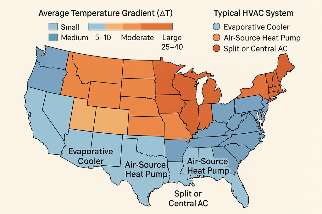 • Southern states (large summer ΔT but mild winter): air-source heat pumps and high-SEER central ACs.