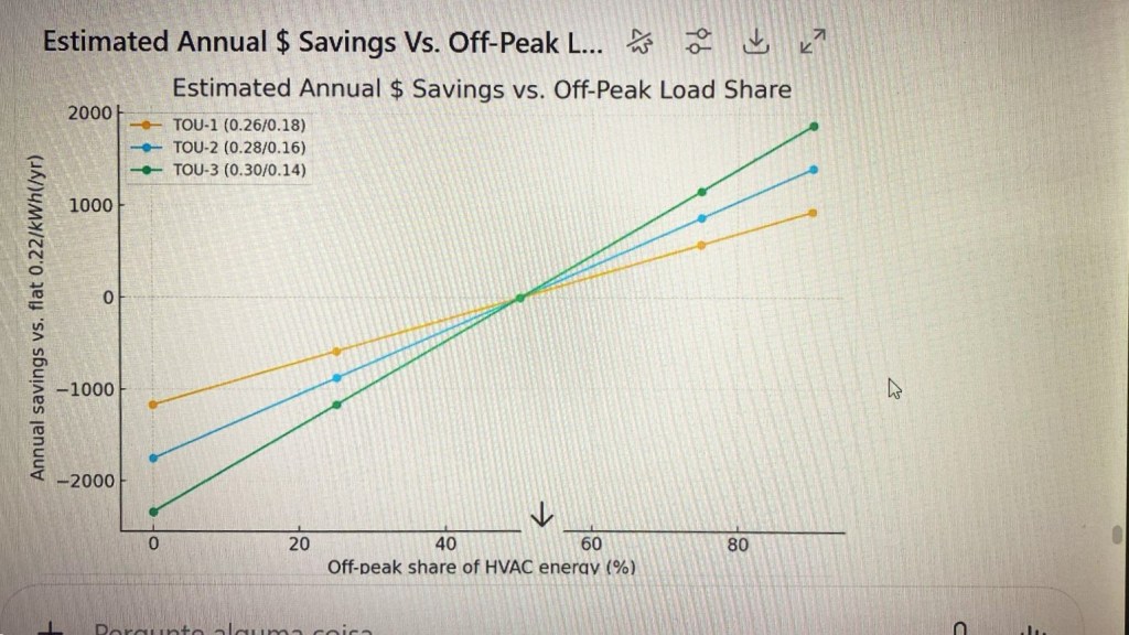 I ran a quick model and posted an interactive table with the annual HVAC cost & savings vs. off-peak share. The plot shows savings grow linearly as you move more load to off-peak; three TOU spreads are included (mild/moderate/aggressive). You can also grab the underlying data as a CSV: