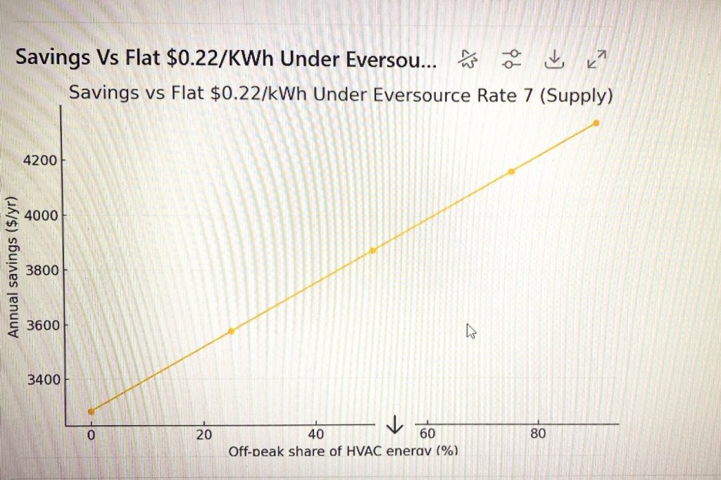 I plugged in Eversource Rate 7 (on-peak $0.10782/kWh, off-peak $0.06746/kWh) and re-ran the model with your HVAC annual use (~29,250 kWh).