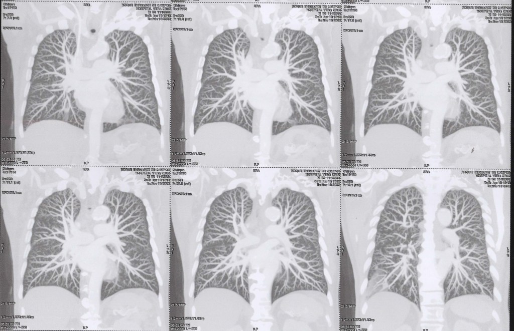 (TC) de Tórax com cortes coronais (vista frontal), em janela pulmonar, com técnica MIP (Maximum Intensity Projection).