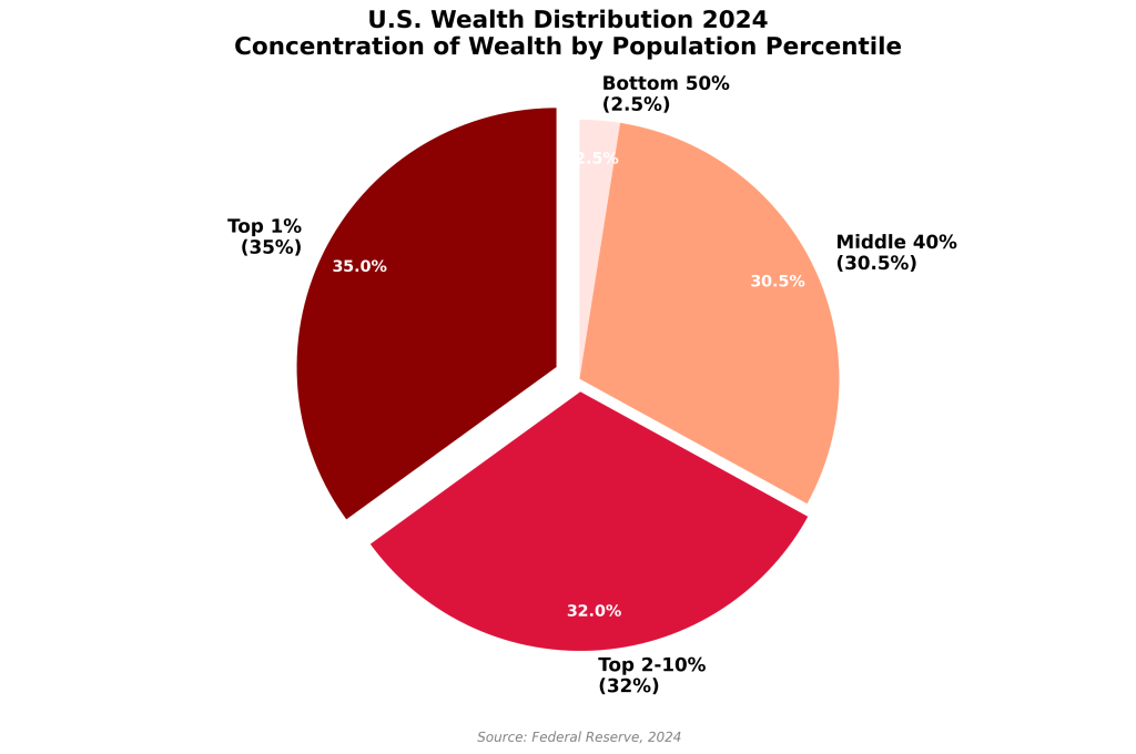 O 1% mais rico detém aproximadamente 35% da riqueza total (de acordo com dados históricos).